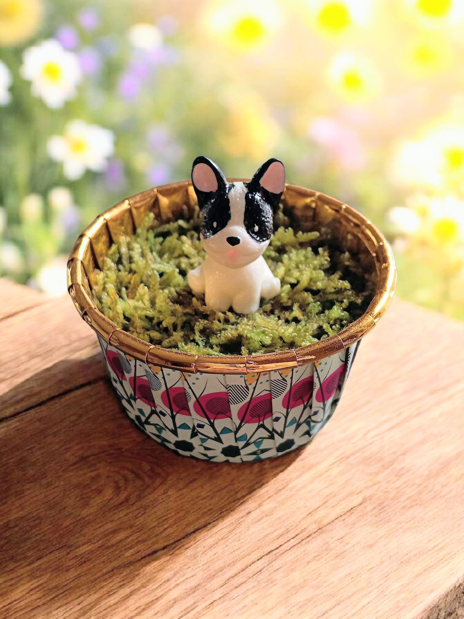 小さな癒しが毎日を変える カップの中から優しく見つめて見守ってくれるワンちゃん 言葉はなくても、まなざしに込められた大丈夫が心をほどいてくれる小さなお守りのよう。 素材 : プリザーブド苔(ハイゴケ) 大きさ : 直径約8cm × 高さ約7.5cm 高温多湿厳禁 乾燥した場所に置いてください。